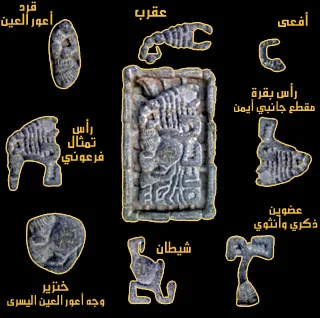 وإذا قلب النقش بزاوية 180 درجة تصير الكتابة أسفل اللوحة وهنا يختلف المشهد تماماً فيظهر لنا النقش تصف وجه إنسان كأنك تنظر له مواجهة هذا الرجل يبدو أنه في العقد الرابع من العمر، هو يعين واحدة كبيرة هي اليمين وعليها ظفرة غليظة وشعره كثيف وكأنه أغصان شجرة وعلى رأسه عقرب كأنه تاج ويظهر في مؤخرة رأس الرجل أعور العين اليسرى وله أنياب وهو أيضا كأنك تنظر له مواجهة . ويظهر لنا النقش وجه خنزير وهو كذلك أعور العين اليسرى وهو أيضا كأنك تنظر له مواجهة كي يظهر في النقش صورة مقطع جانبي أيمن لوجه مصري فرعوني وأحال وضع النقش بشكل أفقي يظهر في النقش مما يعتقد أنه رأس شيطان وله قرن وهو على كرسي وإذا قلب النقش بشكل أفقي إلى الجانب الآخر يظهر فرج ذكرى وأمامه فرج أنثى .