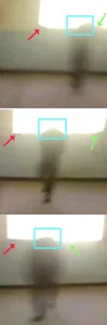-بعدها قمت بتقسيم الفيديو إلى لقطات Frames واخترت اللقطات التي تحوي على الشبح وقمت بتكبيرها وتحليل عناصرها عسى أن أعثر على تفسير ، وفعلاً اتضح أن هناك تغيرات في شكل النافذة التي تقع خلف الشبح الذي يتقدم نحو الامام وأنظر اللقطات متعاقبة وقارن عند الأماكن التي تشير إليها لأسهم، شكل النافذة ومنطقة الرقبة) ، لا أعتقد أن تغيير زاوية الكاميرا يمكن له أن يغير من زاوية النافذة وشكل حدودها، ويبدو أن هناك محاولات متكررة لمسح رأس الشبح المتحرك طالت أيضاً أجزاء من النافذة وكشفت بالتالي الخدعة التي لم تكن متقنة بشكل كاف، يمكن فعل ذلك من خلال إستخدام برامج معالجة الفيديو أو الصور على الحاسب.